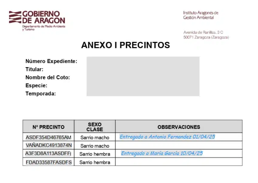 Hechas estas comprobaciones, se pasa a la entrega trazable a los cazadores. La guía propone anotar quién recibe los precintos y qué números concretos se le asignan. El Anexo de Precintos que acompaña a la resolución permite dejar constancia en «Observaciones» de cada entrega y facilita la gestión posterior. A partir de ese momento, el responsable de su correcto uso es el cazador.