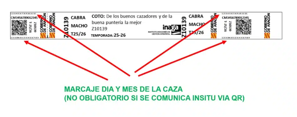 El sistema se estrenó esta temporada en Aragón con el objetivo de mejorar la trazabilidad y agilizar los trámites. Los tradicionales precintos de plástico ceden el sitio a un soporte similar a una pulsera adhesiva, impresa con QR, número y datos del coto, especie, sexo y temporada. Ahora, con la guía publicada por INAGA, quedan claros los procedimientos para la recepción, el uso en el campo y la comunicación electrónica.
