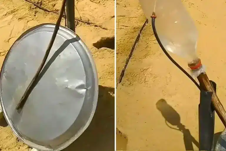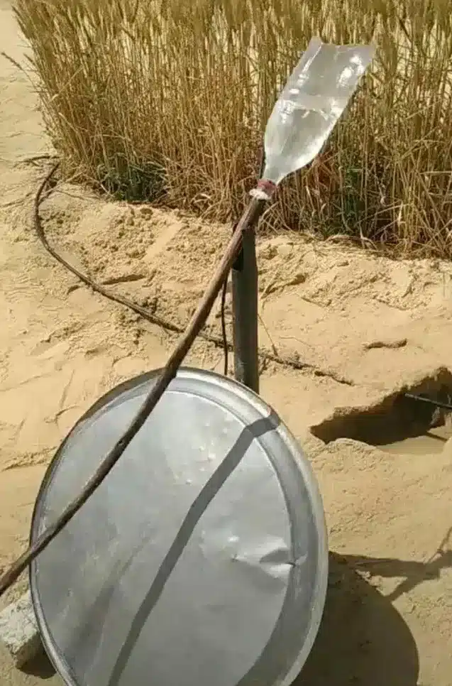 En un vídeo recientemente publicado, se muestra un curioso sistema de prevención de daños agrícolas construido íntegramente con objetos reciclados: botellas de plástico, palos y chapas metálicas. Este rudimentario pero eficaz artefacto no necesita energía eléctrica ni baterías: se activa con el viento y el flujo del agua, produciendo sonidos metálicos que resultan molestos para los animales.