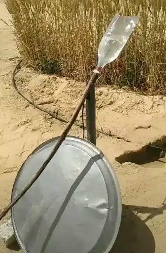 El dispositivo está construido a partir de objetos que cualquiera puede tener a mano: botellas de plástico, palos de madera y chapas metálicas. No hay cables, motores ni baterías. Todo el sistema funciona gracias a fuerzas naturales como el viento o el goteo del agua, lo que lo convierte en una solución especialmente útil para fincas alejadas o sin acceso a electricidad.