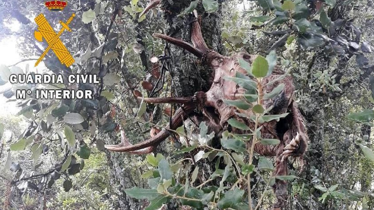 Agentes de la Guardia Civil hallaron ocultas en las ramas de una encina tres cabezas de ciervo macho que se encontraban «en proceso de secado», explican en nota de prensa. Ahora investigan si el titular del coto está detrás del hecho.