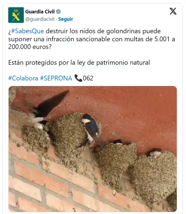 Desde el SEPRONA han recordado más de una vez que está prohibido dañar, molestar o inquietar intencionadamente a los animales silvestres, sea cual fuere la fase de su ciclo biológico, lo que incluye expresamente la retirada, daño o recolección de sus nidos. Las únicas excepciones son aquellas que cuentan con permiso expreso de la Conselleria de Medio Ambiente, algo que no ocurrió en este caso.