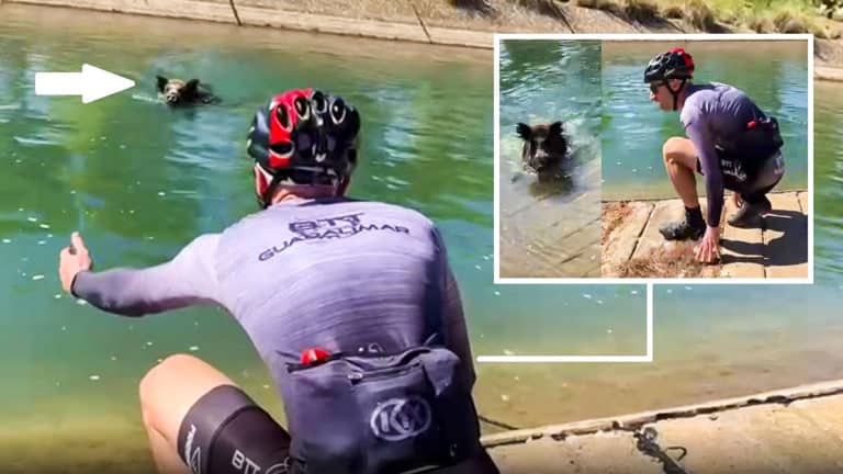 Las imágenes, que se han hecho virales en las últimas horas, muestran cómo los dos ciclistas ven al animal en apuros e intentan llamar su atención, algo que consiguen, pero el carácter bravo de los suidos lleva al jabalí a, tras subir la rampa, embestir contra el hombre. Le propina varios golpes e incluso hace que tenga que tirarse al agua para evitar sus derrotes.