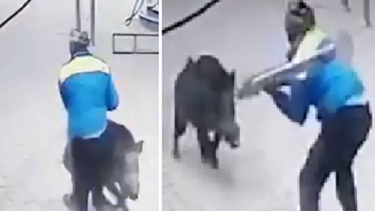 Un jabalí embistió el pasado lunes 6 de enero a los empleados de una gasolinera situada en la ciudad india de Sultanpur. En la grabación, captada por las cámaras de seguridad de la estación de servicio y publicada por el medio An Article, se ve cómo el enorme macareno se lanza una y otra vez contra los dos hombres, que intentan salir impunes de las constantes embestidas del verraco.
