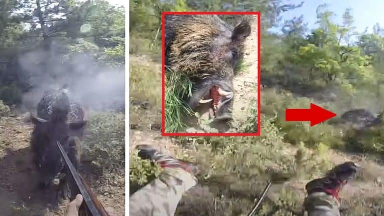 El hombre corre en primera instancia escopeta semiautomática en mano hacia donde los perros ladran, pero pronto ve moverse la vegetación. Como un tren a punto de descarrilar aparece el jabalí y se va derecho a por el hombre. Este último acierta, afortunadamente, pero no puede evitar caer de espaldas.