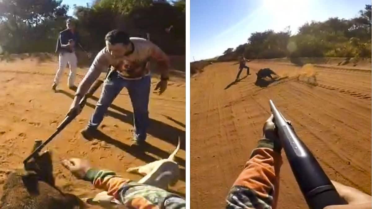 Es lo que muestra el vídeo que reproducimos a continuación, en el que se ve cómo un jabalí alcanzado por un primer disparo ataca a dos individuos que lo dieron por muerto antes de tiempo. El enorme macareno cruza un camino y es entonces cuando recibe el primero de los disparos del cazador; su compañero quiere acercarse a él pero éste hace ademán de huir y de embestirle a la vez no sólo en una ocasión, sino hasta en tres, hasta que un último disparo y el cuchillo de remate hacen que se tumbe.