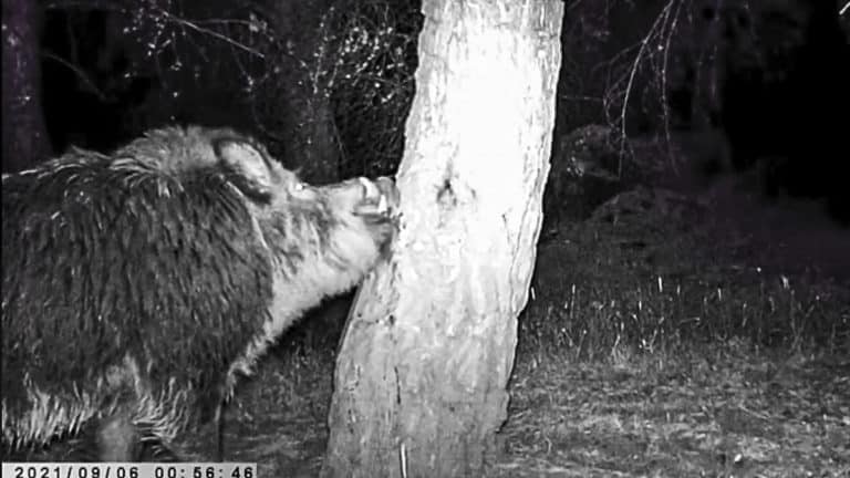 En el siguiente vídeo, grabado por el cazador Antonio Torrescusa, de Huntsmenclub, y publicado en TikTok en los últimos días, un enorme macareno marca territorio y se desprende así de los parásitos que pueda tener en la corteza de lo que parece un pino -los árboles resinosos, por las propiedades de este material, también son preferidos por los suidos-.