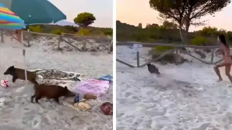 En primer lugar y con el atardecer de fondo, las imágenes muestran cómo dos jabalíes se acercan a las pertenencias de dos jóvenes que se encontraban en dicha playa. Parecía que solo iban a husmear entre sus pertenencias, pero finalmente pudieron comprobar que sus intenciones iban mas allá.