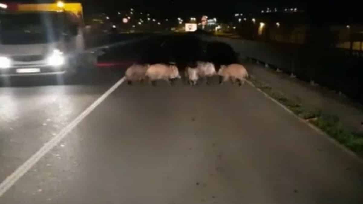 Mientras los suidos se encuentran deambulando por la calzada, el ocupante de un vehículo, que afortunadamente pudo verlos a tiempo, los graba. Si hubiesen cruzado en el momento en el que un coche en dirección contraria viniese, las consecuencias podrían ser fatales.