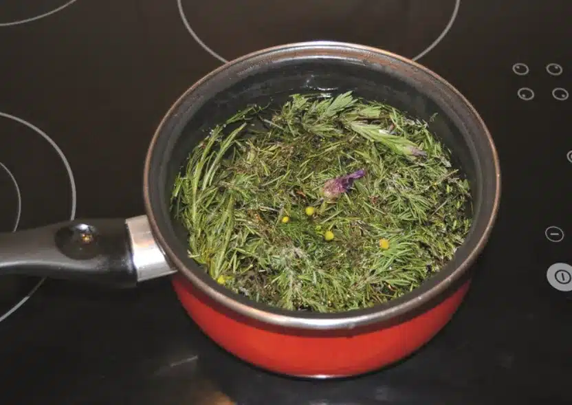 Hierve estas plantas en unos 200 mililitros de agua durante al menos diez minutos. El objetivo es extraer al máximo su esencia y lograr una infusión concentrada que dará identidad olfativa al jabón. Es importante tapar el cazo durante la cocción para evitar la evaporación excesiva.