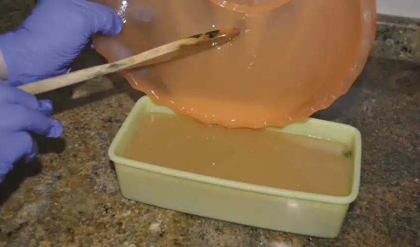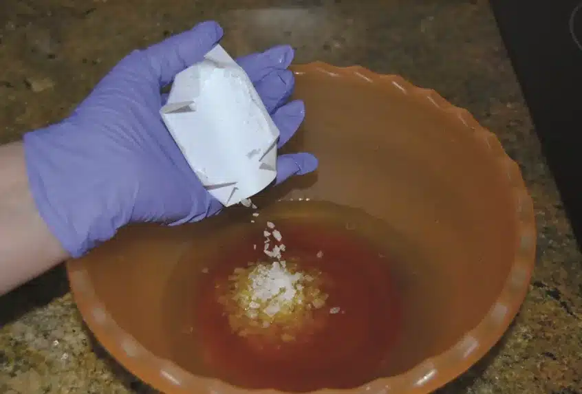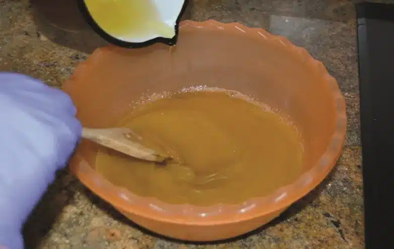 Una vez templada la infusión, cuélala y deja que repose media hora. Añade con precaución 60 gramos de sosa cáustica, removiendo con una cuchara de madera y usando siempre guantes y mascarilla. Esta mezcla es reactiva y debe manipularse con seguridad.