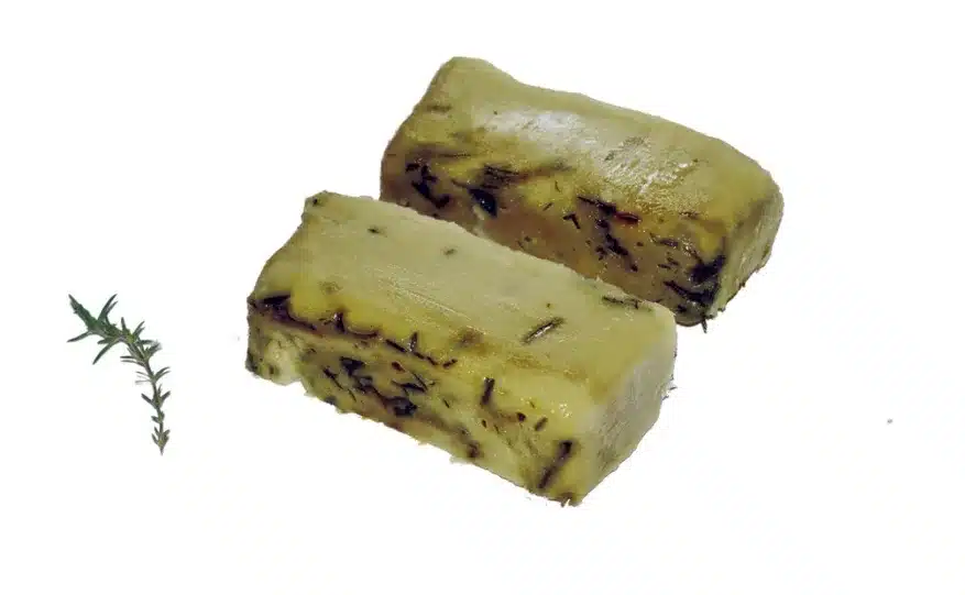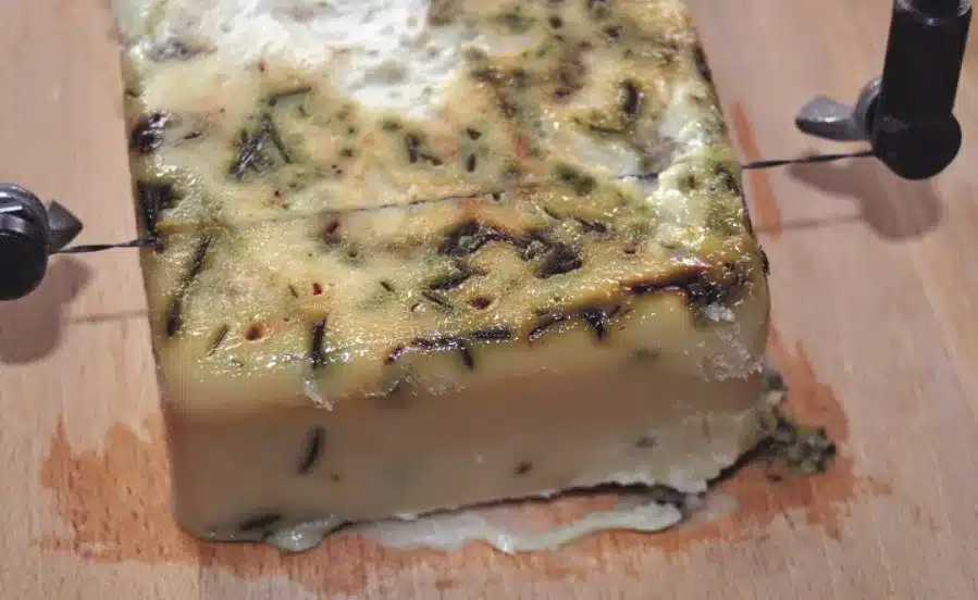 Vierte la mezcla en un molde alargado de plástico, como una simple friambrera, y déjala reposar 48 horas. Después, desmolda y corta en láminas o escamas, dependiendo de si lo usarás para ducharte o para lavar la ropa. Si añades hojas de romero o tomillo como decoración, el acabado será más artesanal.