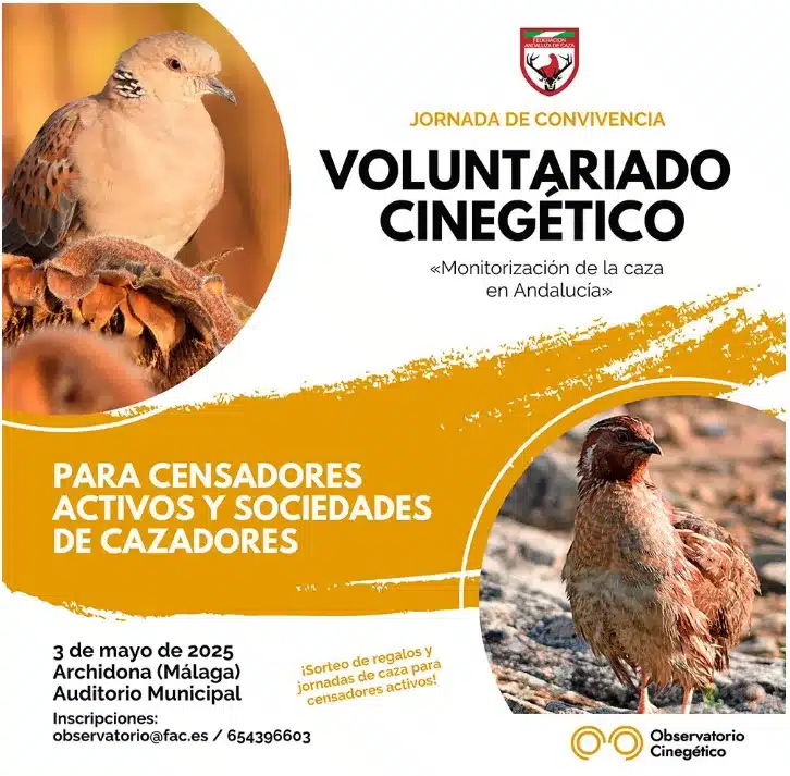 La Federación Andaluza de Caza ha anunciado la apertura del plazo de inscripción para participar en la Jornada de Convivencia sobre el Voluntariado Cinegético: monitorización de la caza en España, que tendrá lugar el próximo 3 de mayo en Archidona, coincidiendo con la XXXII Feria del Perro. Esta actividad, con aforo limitado, busca poner en valor el trabajo del voluntariado cinegético andaluz.