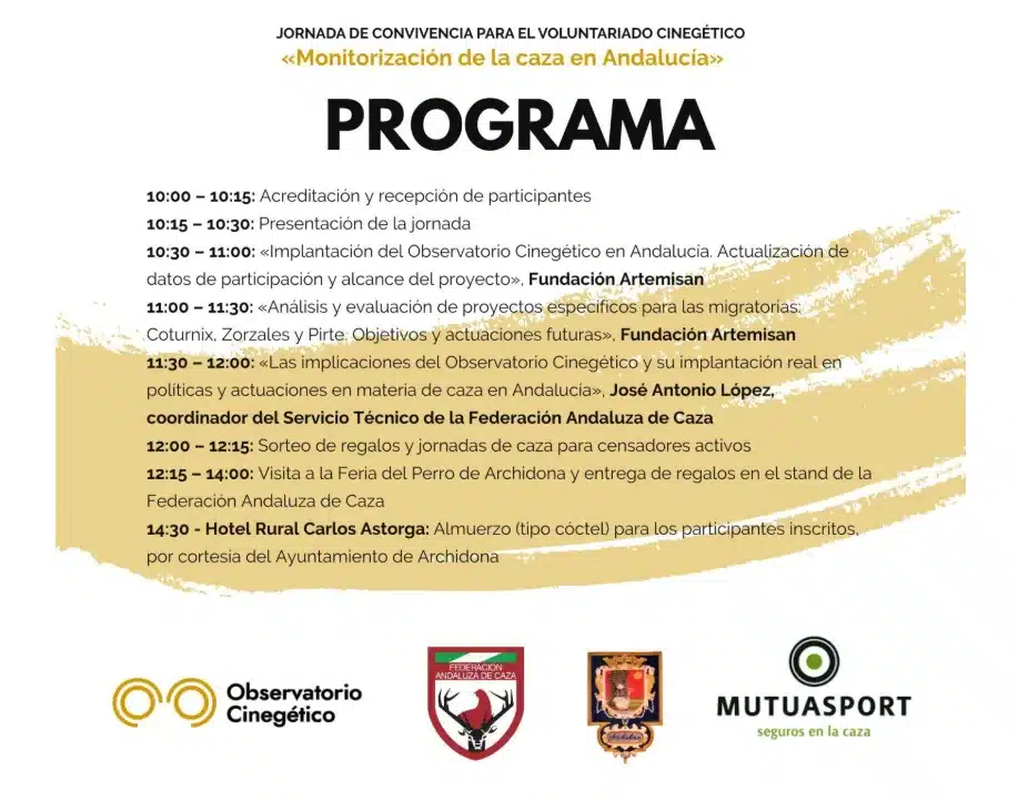 La jornada comenzará a las 10:00 de la mañana en el Auditorio Municipal de Archidona, donde técnicos de la Federación Andaluza de Caza y de la Fundación Artemisan ofrecerán tres breves charlas. En ellas se abordará la relevancia de distintos proyectos científicos como Coturnix, Zorzales, PIRTE o el Observatorio Cinegético, fundamentales para el presente y futuro de la caza sostenible en España.