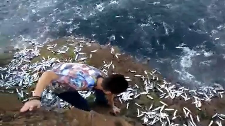 La filmación, en la que se ve a un chico agachado que no para de coger sardinas, se ha compartido en las últimas horas rápidamente en las redes sociales. Miles de peces tapizan las rocas junto a los jóvenes que graban atónitos la escena.