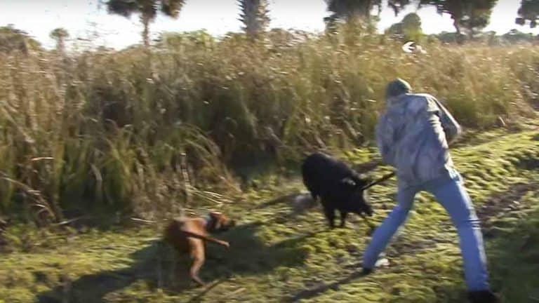 El suido se esconde en una zona espesa, donde los perros delatan su posición. El cazador llega hasta el lugar e intenta alcanzar con su lanza al jabalí, que sin embargo escapa. Sin embargo, el protagonista del vídeo no cesa en su empeño: se dispone una vez más a buscar al animal hasta que finalmente en un claro y flanqueado por dos de sus perros, se para.