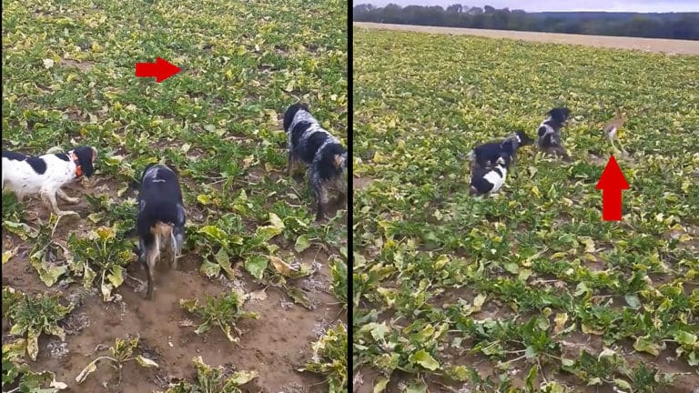 En la filmación se puede ver cómo la orejuda, que permanece encamada mientras dos de los perros muestran su posición, aguanta confiando en su mimetismo hasta que uno de los perros casi la pisa. En ese momento la liebre da un salto por encima de los tres perros y escapa a la carrera.