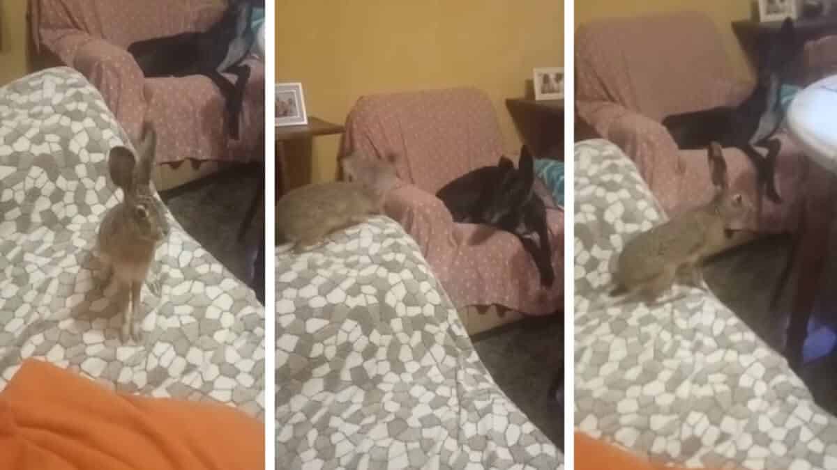 Este perro de caza se encuentra con una liebre ¡y se ponen a jugar!