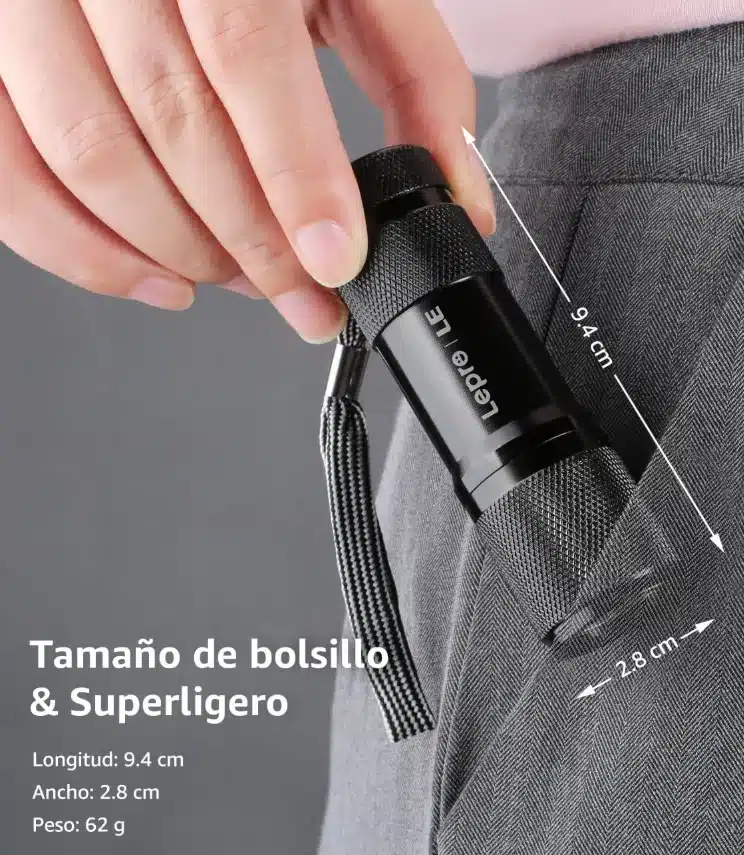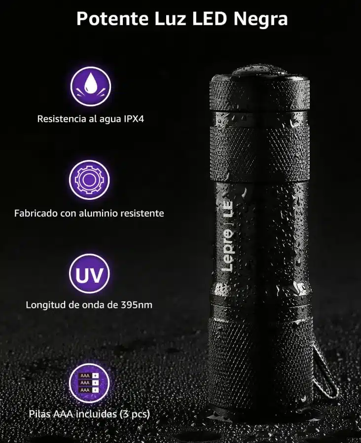 Entre los modelos más vendidos y ahora rebajados, destaca la Lepro Linterna Ultravioleta de 9 LED. Esta linterna emite luz de 395nm y tiene múltiples aplicaciones: desde detectar orina de mascotas hasta verificar documentos oficiales. Es ligera, portátil, resistente a golpes y salpicaduras (IPX4) y viene con tres pilas AAA incluidas.
