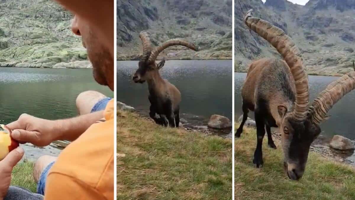 El vídeo que te mostramos a continuación demuestra por qué nunca hay que fiarse de un animal salvaje: un hombre se está comiendo un melocotón mientras un imponente macho montés se encuentra frente a él. El hombre, que está acompañado de otra persona que graba atónita la escena, le va echando las cáscaras de melocotón a un macho montés, y éste se va acercando poco a poco al lugar en el que se encuentra.