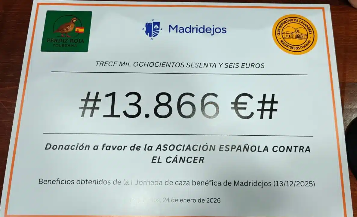El municipio toledano de Madridejos ha vuelto a demostrar que el campo también sabe arrimar el hombro cuando la causa lo merece. El Club Deportivo de Cazadores de la localidad cerró el pasado sábado 24 de enero una intensa jornada benéfica con la entrega de un cheque de 13.866 euros a la Asociación Española Contra el Cáncer (AECC) de Toledo, en un acto cargado de simbolismo.
