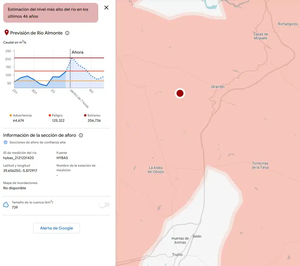 Flood Hub se apoya en modelos de inteligencia artificial que combinan datos públicos y sistemas predictivos para anticipar inundaciones con hasta una semana de antelación. En puntos señalados como de riesgo extremo, la herramienta permite incluso consultar el caudal del río en tiempo real, algo clave para valorar si un cruce es seguro o no.