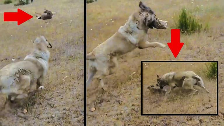 El vídeo es impactante: en apenas unos segundos se ve cómo una hembra de mastín español atrapa al vuelo una liebre que le viene corriendo como un rayo. El gran volumen del perro, por la raza que es, no impide que su flexibilidad y agudeza visual le permitan dar caza a la liebre al vuelo.