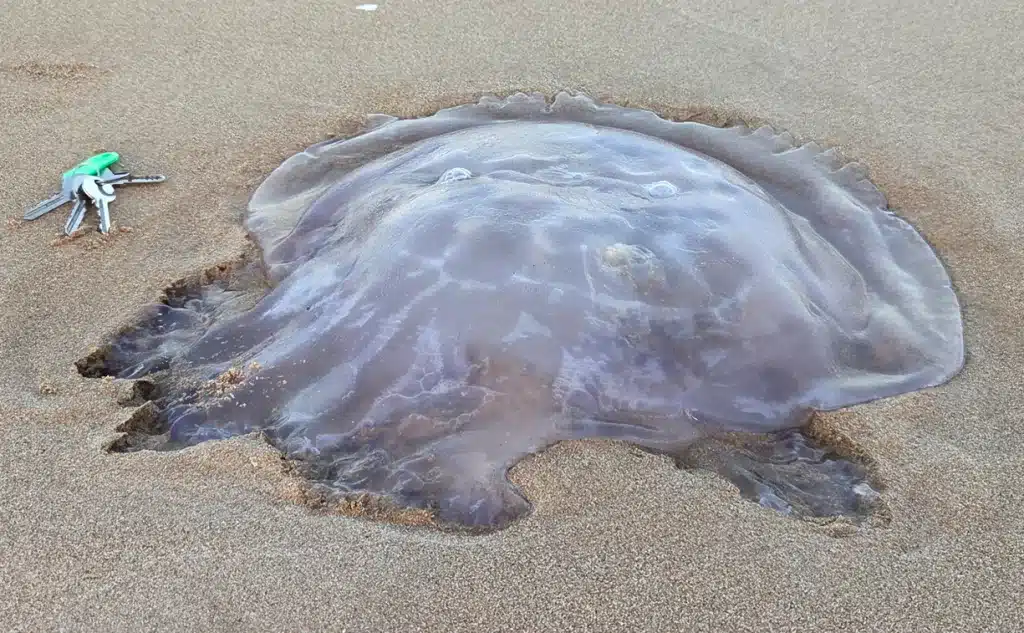 Con un cuerpo gelatinoso que parece sacado de una película de ciencia ficción y un diámetro que supera holgadamente los 60 centímetros, todo apunta a que se trata de un ejemplar de Rhizostoma pulmo, comúnmente conocida como medusa de barril. Esta especie, una de las más grandes que habita las aguas del Atlántico oriental y el Mediterráneo, puede alcanzar más de 90 centímetros de diámetro y superar los 30 kilos de peso.