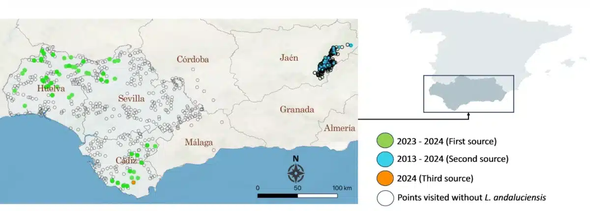 Distribución geográfica de los puntos de muestreo de moscas L. andaluciensis en el sur de España, Andalucía (2013-2024), clasificados según tres fuentes de datos. Los puntos de color (verde, azul y naranja) indican la presencia de L. andaluciensis y los puntos sin color indican su ausencia. © nature.com