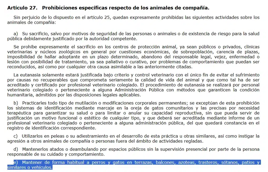 Antes de que la ley entrara en vigor, ya se alertaba del alcance de su articulado. En concreto, del artículo 27, donde se recoge de forma expresa que está prohibido «mantener de forma habitual a perros y gatos en terrazas, balcones, azoteas, trasteros, sótanos, patios y similares o vehículos».