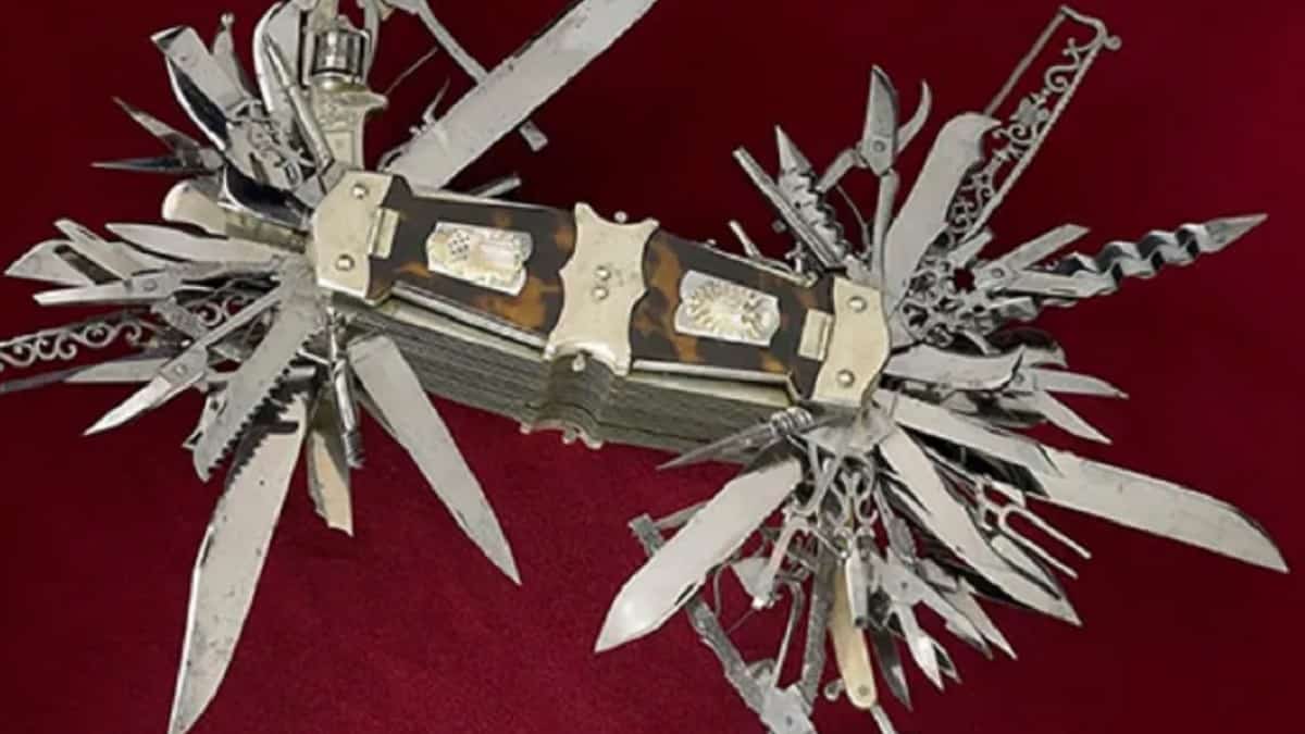 «Si cuenta las miniaturas dentro de las cubiertas del mango de carey, tiene 100 navajas», explica el museo. En ella se incluyen hojas de todos los estilos: una cuchilla dentada, dos cuchillas de daga, varios tipos de tijeras, punzones, sacacorchos, una lanceta, un gancho de botón, un cortador de cigarros, un diapasón, bolígrafos y lápices mecánicos, un espejo, una navaja de afeitar recta y… hasta un revólver de cinco disparos del calibre .22.
