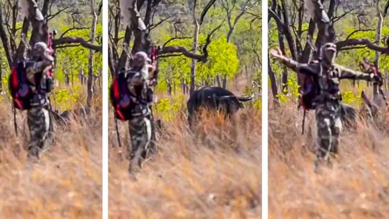 En el vídeo, el cazador con arco permanece totalmente hierático ante un búfalo de agua después de lanzar la flecha. El animal, en cuanto siente el disparo, se levanta y mira fijamente al cazador, que también mira frente a frente a la pieza sin inmutarse.