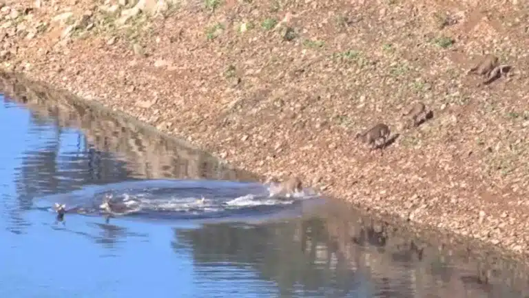 Una vez que están todas en el agua, ya están listas para ir a por el objetivo que se habían marcado antes de saltar. Juntas comienzan a nadar, cruzando el río y con la aparente intención de llegar hasta el otro extremo.