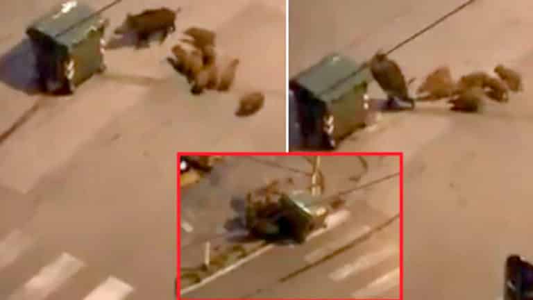Una piara de jabalíes se interna en una ciudad desierta por el confinamiento y consigue tumbar y arrastrar varios metros un contenedor de basura para conseguir comida. Te mostramos el vídeo.