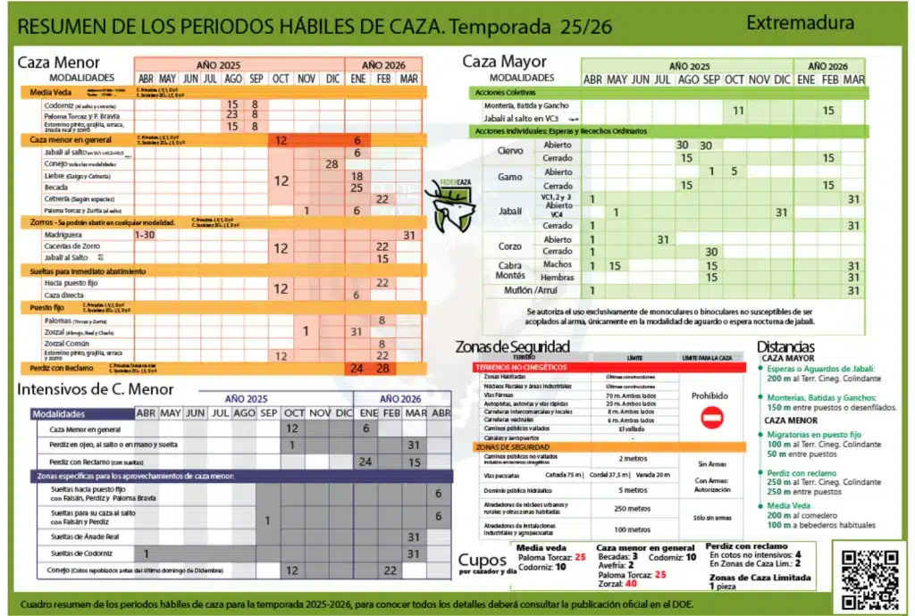 La Federación Extremeña de Caza ha compartido además un cuadro resumen visual que facilita la consulta de los periodos y días hábiles por especies, modalidades y meses, lo que permite a los cazadores planificar con mayor claridad sus salidas al campo. Este cuadro incluye tanto la caza menor como la caza mayor, la media veda, las acciones colectivas e individuales, los intensivos y las zonas de seguridad.