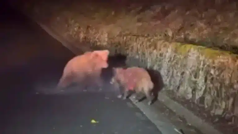 Un vecino que circulaba por una carretera cercana a la población de Canejan, en Lérida, se topó con un espectacular ejemplar de oso mientras este atacaba a un jabalí. Las imágenes son espectaculares. Todo sucede al pie de una carretera. Se observa claramente que el jabalí está gravemente herido en el lomo mientras el oso trata de reducirlo. Sin importarle la presencia del conductor ni las luces que lo alumbran, el oso consigue subir el muro que separa carretera y monte con el jabalí entre sus fauces.