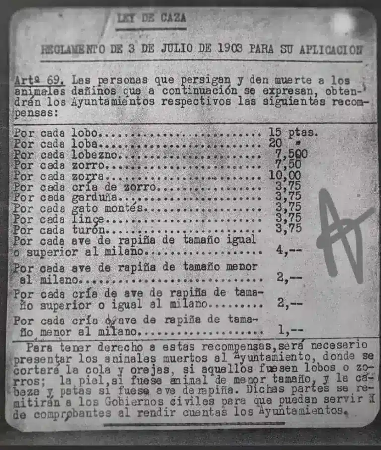 Aquella filosofía quedó plasmada con claridad en el Reglamento de 3 de julio de 1903, que desarrollaba la Ley de Caza vigente en aquel momento y que detallaba incluso las cantidades que debían pagarse por cada animal abatido.