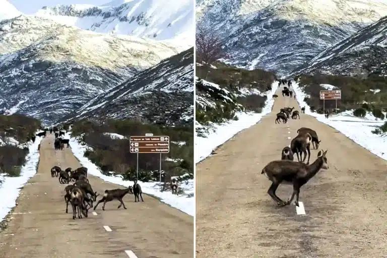 Este tipo de escenas, aunque espectaculares, también obligan a extremar la precaución. En carreteras de montaña, un grupo de animales así puede aparecer tras una curva y provocar un susto serio. Y en un entorno nevado, cualquier frenazo de más puede acabar mal.