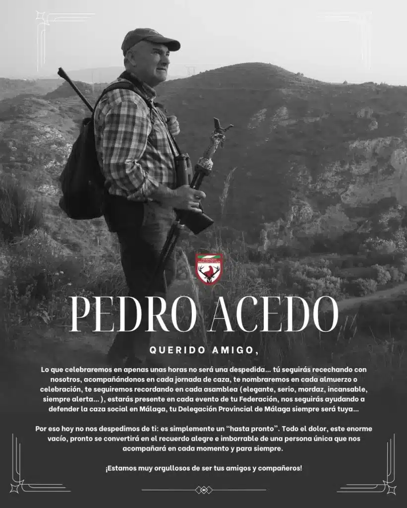 Pedro Acedo Bellido, delegado provincial de la Federación Andaluza de Caza (FAC) en Málaga durante más de una década y miembro esencial de su Junta Directiva, ha fallecido este martes dejando un vacío inmenso entre sus compañeros y amigos. Su desaparición ha sacudido a toda la comunidad cinegética andaluza, que lo recuerda por su entrega, rectitud y pasión desinteresada en defensa de la caza social.