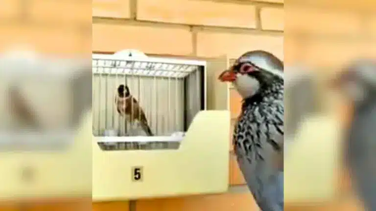 El jilguero aparece dentro de su jaula, mientras la perdiz permanece sobre la mano del hombre que está presenciando la escena y grabando el vídeo. Ambas aves comienzan a cantar y su interacción empieza, poco a poco, a convertirse en un auténtico dueto.