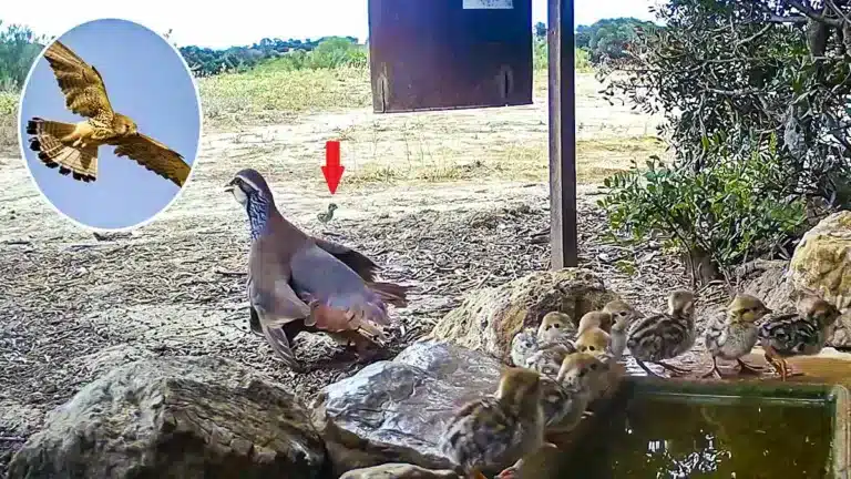 Ésta muestra cómo una perdiz roja se enfrenta a un cernícalo para defender a sus pollos en una época en la que la patirroja se encuentra en plena cría. Mientras los polluelos beben agua, su madre no deja de mirar al cernícalo e incluso cuando dos de los perdigones se alejan del lugar, ésta permanece alerta.