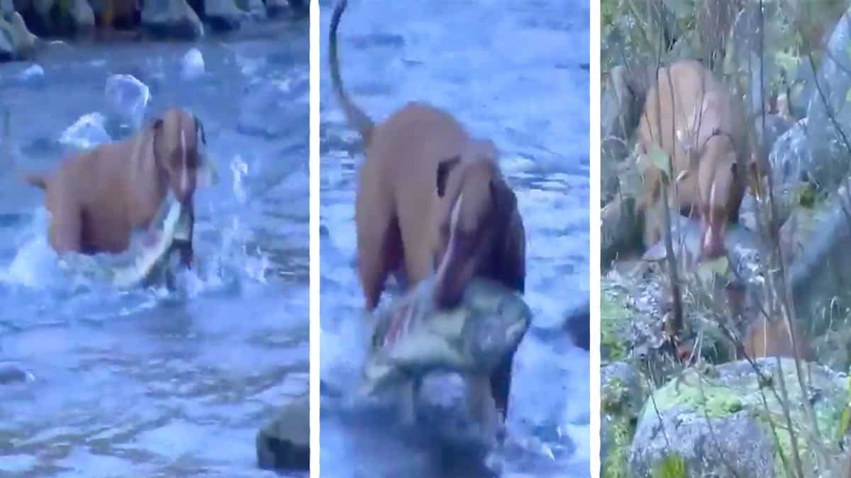 En las imágenes se puede ver cómo dos perros de caza se lanzan a un río para pescar salmones. Lo hacen con una habilidad pasmosa. Uno a uno, los van sacando hasta la orilla, donde su dueño los espera para recogerlos, cámara en mano.