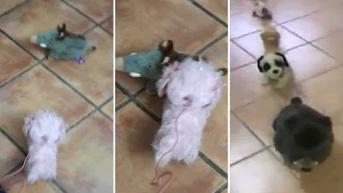En el primer vídeo se observa a un perro de color rosa ‘acosando’ a un jabalí en su propio encame. Mientras, las voces de ánimo del perrero resuenan por las sierras de su salón. Además, el movimiento de cabeza que realiza el perro de juguete lo convierte en todo un podenco puntero de rehala, de esos que levantan caza más que ningún otro.