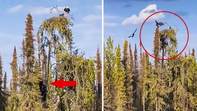 El oso escala una gran conífera para llegar hasta el nido de águilas