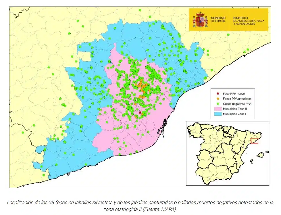 Con la actualización publicada por el ministerio, el número total de focos detectados asciende ya a 38, de los cuales tres son considerados primarios y 35 secundarios. En total se han confirmado 227 jabalíes positivos distribuidos en nueve municipios del área metropolitana.