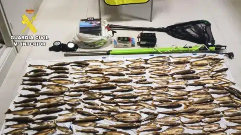 La Guardia Civil ha abierto una investigación a dos vecinos de Cangas del Narcea, de 58 y 63 años, por un presunto delito contra la flora y la fauna. Los hombres fueron sorprendidos el pasado 25 de agosto, cuando viajaban por una carretera de la localidad a las cuatro de la madrugada, con una bolsa con 215 truchas y varios utensilios para realizar la pesca eléctrica, una práctica ilegal en España.