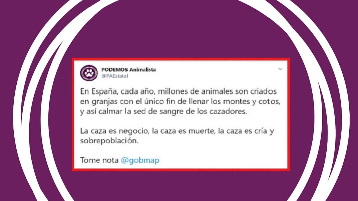 En el caso de Podemos Animalista fueron más allá, subiendo el siguiente mensaje a sus redes sociales: «En España, cada año, millones de animales son criados en granjas con el único fin de llenar los montes y cotos, y así calmar la sed de sangre de los cazadores. La caza es negocio, la caza es muerte, la caza es cría y sobrepoblación».