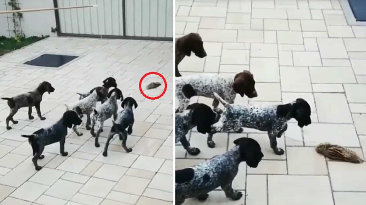 A continuación te mostramos una muestra con la caña de seis cachorros de braco alemán que seguro que se te quedará grabada varios días en la mente. A pesar de tener tan sólo unas semanas de vida, son capaces de mostrar dónde se encuentra el señuelo que el cazador ha colocado en el suelo para ver su instinto de muestra con la ayuda de la caña.
