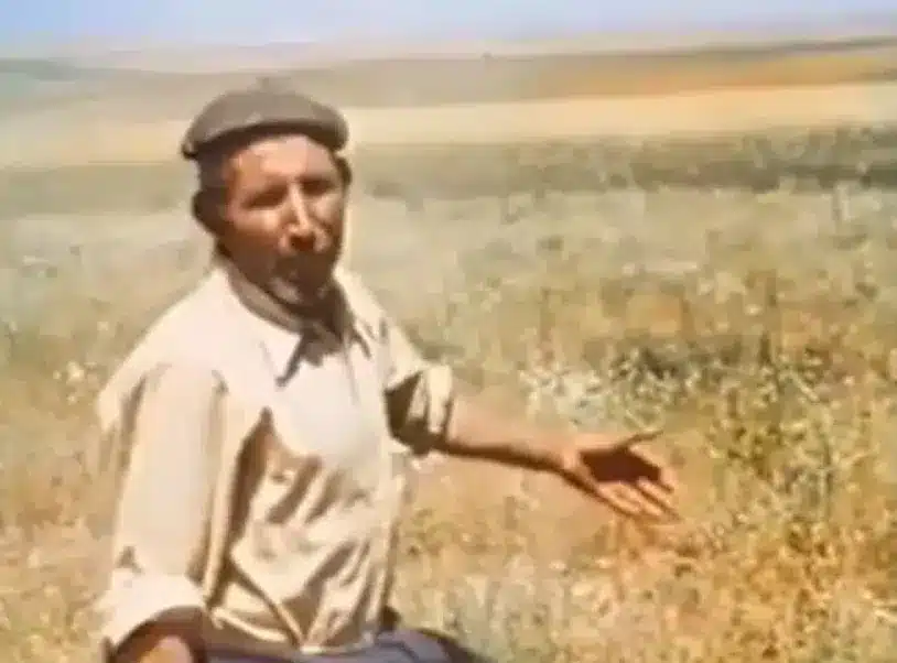 Uno de los hombres que aparece en el documental habla mientras sostiene una hoz. Explica que su sustento depende de «dos hectáreas» de terreno donde cultiva algarrobas, trigo y cebada para alimentar a sus animales. Su relato transmite la realidad de una agricultura de subsistencia, en la que cada jornada de trabajo era imprescindible para mantener la explotación familiar.