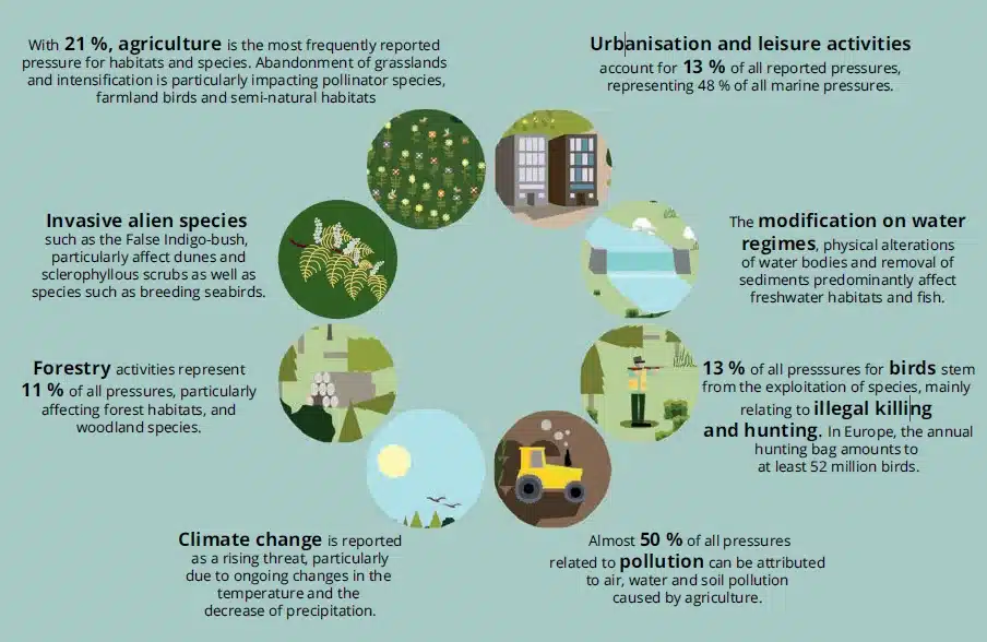 La Federación Europea para la Conservación y la Caza (FACE) ha hecho público un análisis basado en los datos del último State of Nature de la Unión Europea. El documento, cuyos datos más significativos han sido difundidos a través de su perfil oficial de Facebook, insiste en que los factores que más deterioran los ecosistemas del continente no tienen que ver con la actividad cinegética, sino con la transformación masiva del territorio, la contaminación y otros impactos de origen humano que llevan años acumulándose.